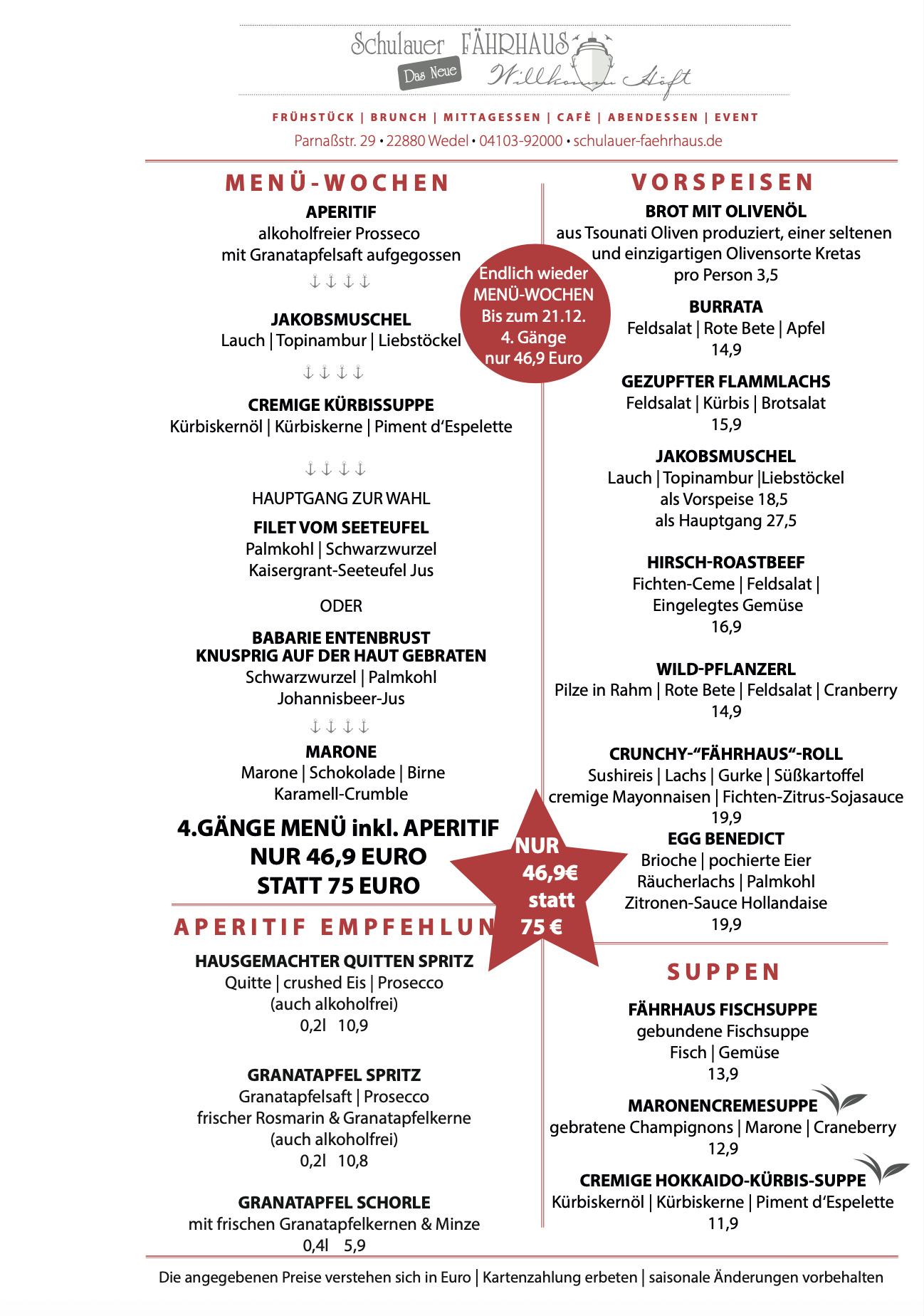 Im Winter, von Januar bis Mitte März, sind wir Montag bis Donnerstag von 12:00 bis 18 Uhr für Sie da (druckend warme Küche bis 17 Uhr). Freitag bis Sonntag bis 22 Uhr (durchgehend warme Küche bis 21 Uhr). Frühstück bieten wir Samstag & Sonntag um 9:30 bis 11:30 Uhr an. Und unseren Brunch immer sonntags von 10:30 bis 13:30 Uhr.