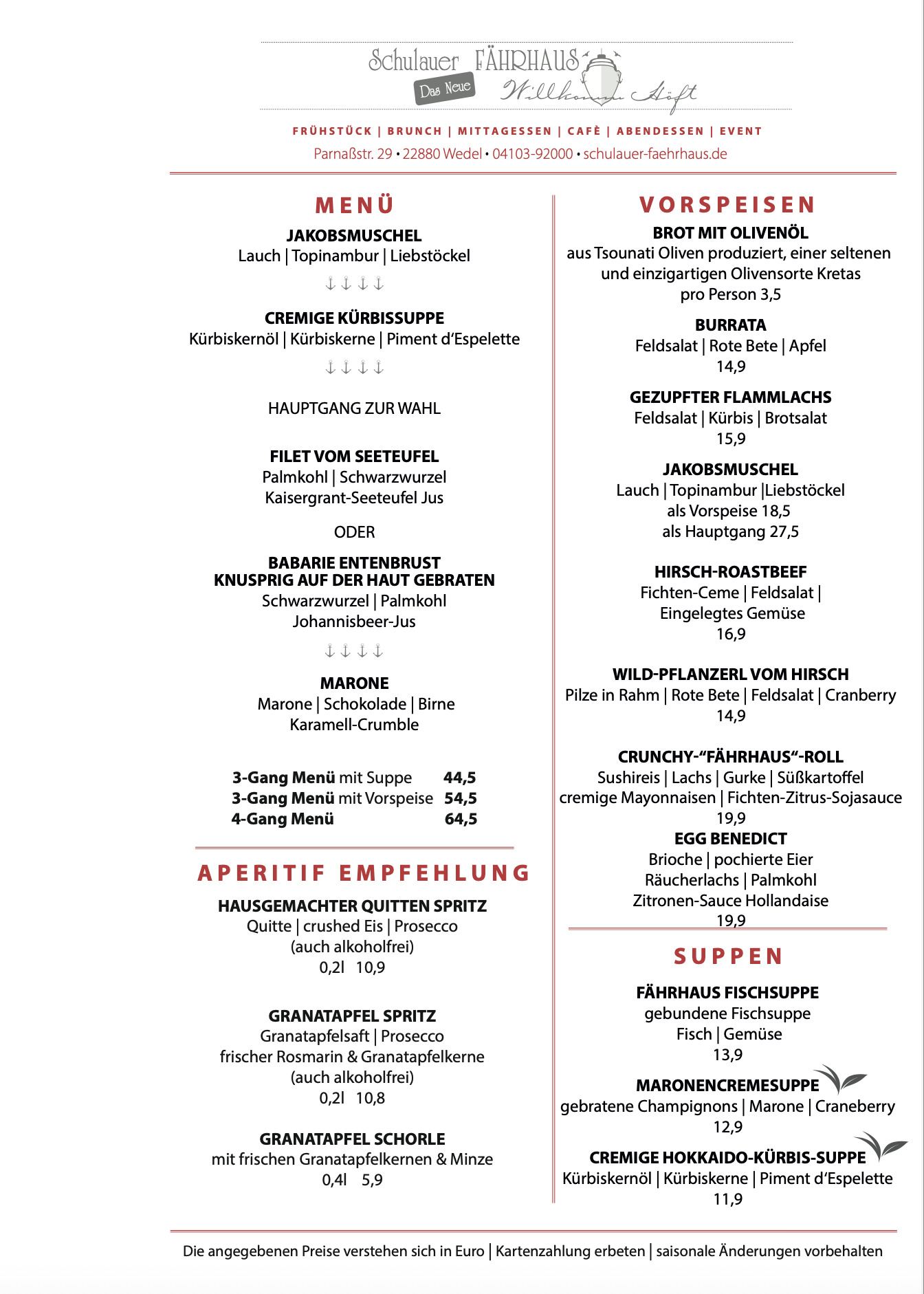 Im Winter, von Januar bis Mitte März, sind wir Montag bis Donnerstag von 12:00 bis 18 Uhr für Sie da (druckend warme Küche bis 17 Uhr). Freitag bis Sonntag bis 22 Uhr (durchgehend warme Küche bis 21 Uhr). Frühstück bieten wir Samstag & Sonntag um 9:30 bis 11:30 Uhr an. Und unseren Brunch immer sonntags von 10:30 bis 13:30 Uhr.